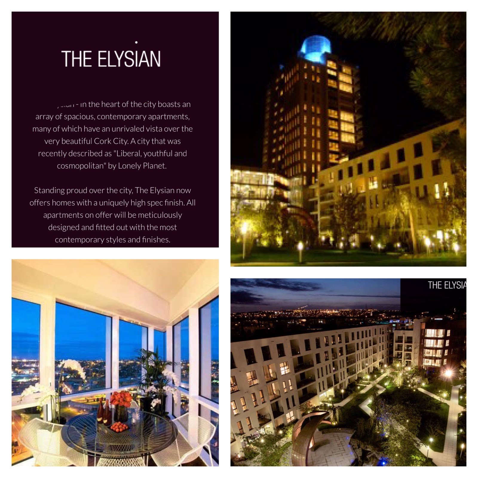 His son, who he has not seen for many years, Victor never married the mother of his son, he did not even come back for her funeral is picking him up. The son has his own son, Victor did not even know he was a grandfather.  His son has a very good job at a high tech company.  He has booked a penthouse suite at The Elysium (pictured above) for his father.  It is the premier luxury building in Cork, a product of better days in Ireland. Victor lives in council housing in London so even though he is a bit hurt he is not staying with his son this takes him back to his old Rock Star days, when he and his band mates used to trash luxury suites.